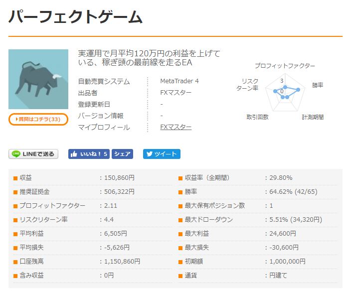 今まで200本以上ものEAを作り続けてきたそうです。今回は、その中でも最高傑作のEAとしてこちらのパーフェクトゲームをゴゴジャンで出品して頂けました。作者曰く、約200以上ものEAを作り続けたその中で、「四天王」と位置づけたEAがこのパーフェクトゲームとなります。今後の続編も楽しみですね。